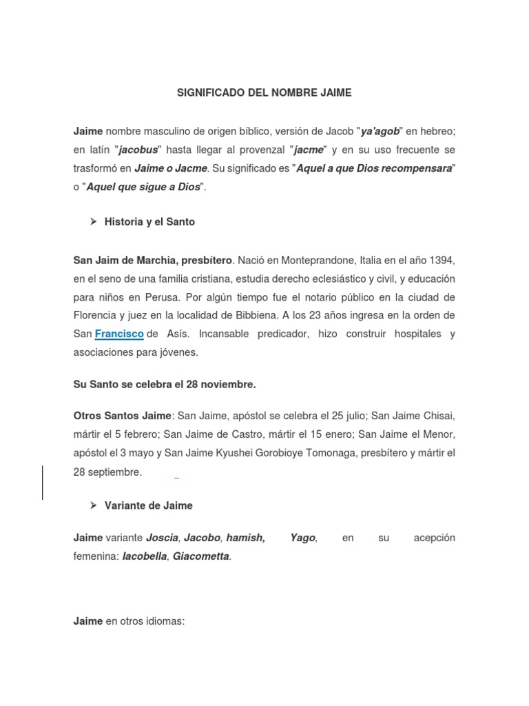 Sus variantes son Jacob Yacob forma sefardí Iago Llago Yago y JaimeCon el apócope de santo San da origen a Santiago y sus formas cortas Tiago Thiago y probablemente Diego. Jacobo es la transcripción usual en español del nombre propio Yaakov en hebreo יעקב. En latín jacobus hasta llegar al provenzal jacme y en su uso frecuente se trasformo en Jaime o Jacme. Significado del nombre Jaime y ideas similares de nombres para niños y niñas. Significado de nombre Jaime origen y significado de Jaime características y día del santo. El color rojo vivo será el adecuado mientras que como talismán de protección podrá utilizar una llave de hierro o la imagen de un gavilán. Amante del campo y los animales.
